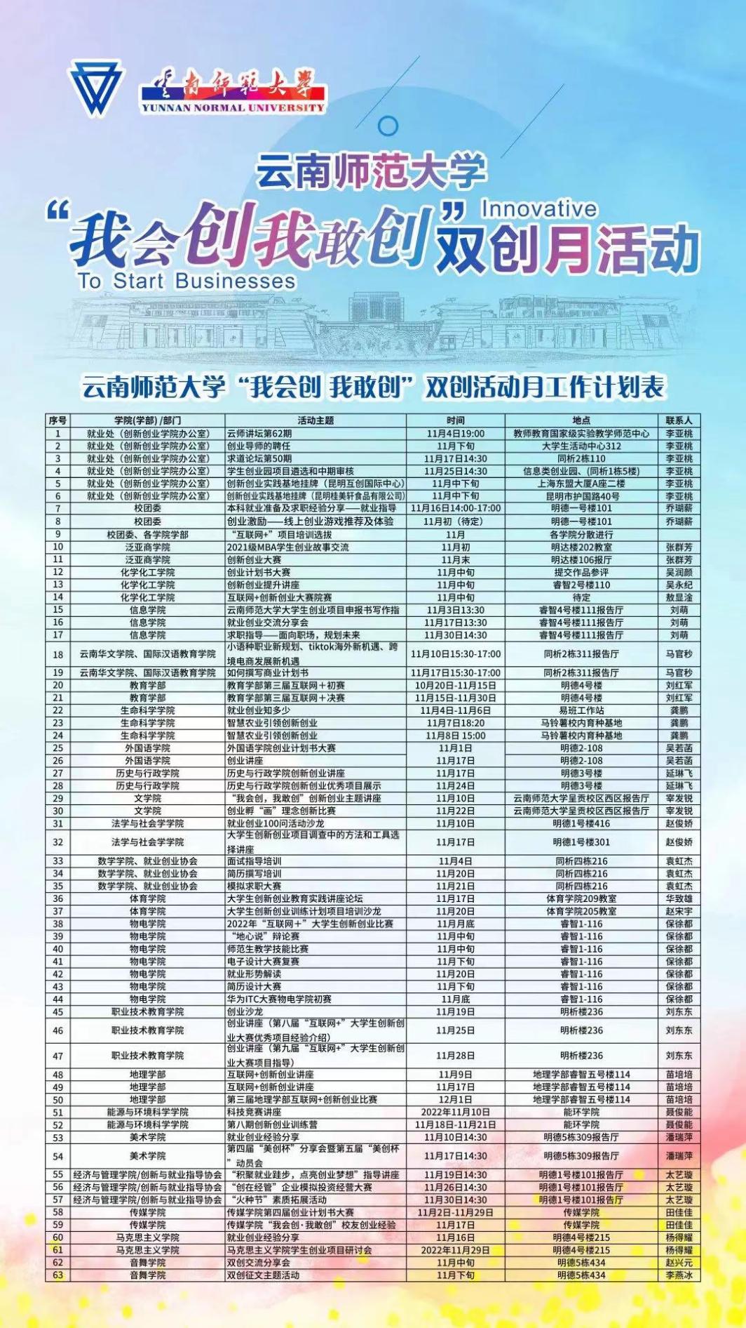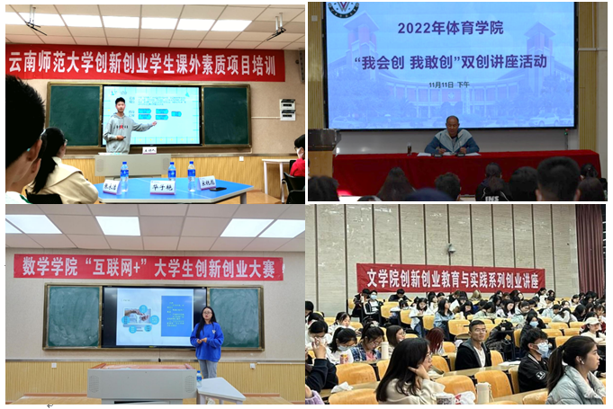 双创活动月自11月启动以来,在就业处(创新创业学院)的主导下,在团委及相关学院(学部)的大力支持下,开展了丰富多彩的双创活动:以“云师讲坛”、“求道论坛”、“学生创业园项目中期审核”、“创业就业实践基地挂牌”等活动为主线,邀请业界专家、创业导师、企业优秀人员、政府相关人员来校作项目指导、经验分享和政策宣传,扩展大学生创业就业实践基地,举办就业创业的相关讲座、培训,主要从政策宣讲、经验分享、成果展示、活动带动、典型激励等方面,为我校师生全方位集中呈现一场创新创业文化盛宴。