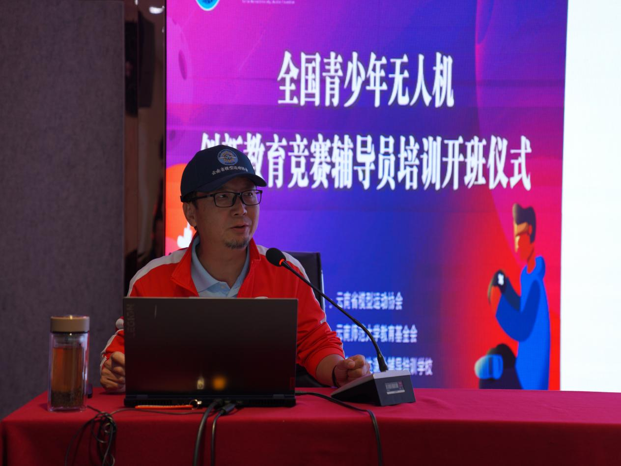 云南省模型运动协会宣传部长刘伟向学员们介绍了开展青少年航空模型(无人机)活动的意义,并进一步解释了青少年无人机创新教育竞赛的项目介绍和项目规则。