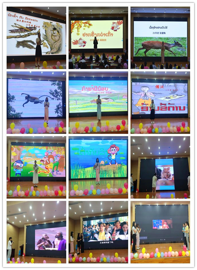 手抄报比赛以“学习党的二十大、奋进新征程”为主题,一幅幅图文并茂、创意满满的作品表达了同学们以笔为“媒”,以心为“画”,响应党的号召,紧跟党的步伐的坚定理想信念。讲故事比赛围绕老挝民间故事展开,选手们声情并茂,落落大方,展现出优秀的语言功底和稳健的台风。老挝语配音比赛中,同学们用老挝语对《西游记》《灰姑娘》《夏洛特烦恼》等经典影视作品进行惟妙惟肖地配音,塑造了一个个生动鲜明的角色和形象,将比赛气氛推向高潮,扎实的语言功底和精彩的表演赢得了评委老师和观众的一致好评。