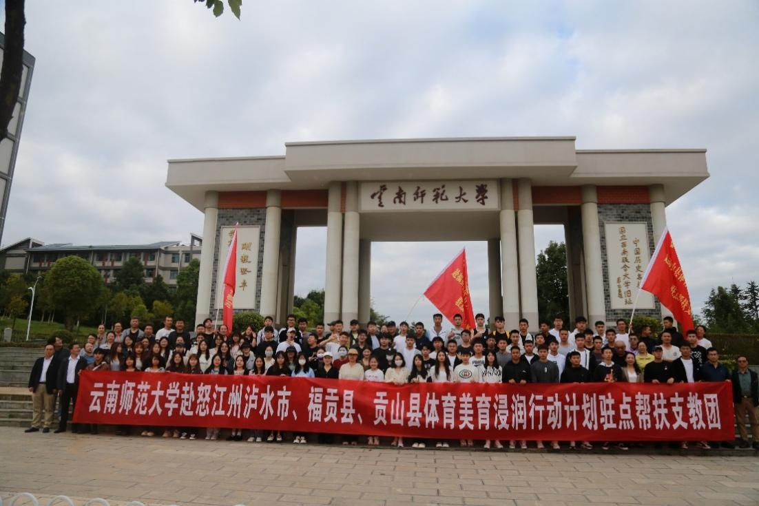 9月18日,云南师范大学赴怒江州泸水市、福贡县、贡山县体育美育浸润行动计划驻点帮扶支教团举行出征仪式。美术学院党委书记包绍红、院长戴杰鼓励参加浸润计划的同学们结合所在学校地域文化特点与现实条件,积极思考、创新思维、主动作为,在美育教学、社团活动、竞赛展演、校园文化、工作坊建设中团结协作、同心协力,圆满完成美育浸润行动计划。