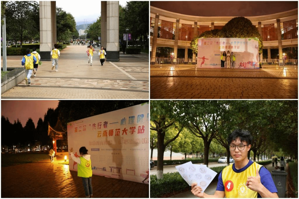 心理健康教育咨询中心积极落实、认真组织,共有20个学院(学部)500名同学踊跃参加活动,50余名同学参与志愿服务,并在呈贡校区设置“三校碑、三校亭、心理健康教育咨询中心、美术学院、东区田径场”5个打卡点位,一二一校区设置“西南联大仿制门、南门(3号门)、田径场”3个打卡点位,积极营造西南联大在昆建校暨云南师范大学建校85周年的热烈氛围,让学生熟悉校园的同时,体会体育、美育对心理健康的正向影响。
