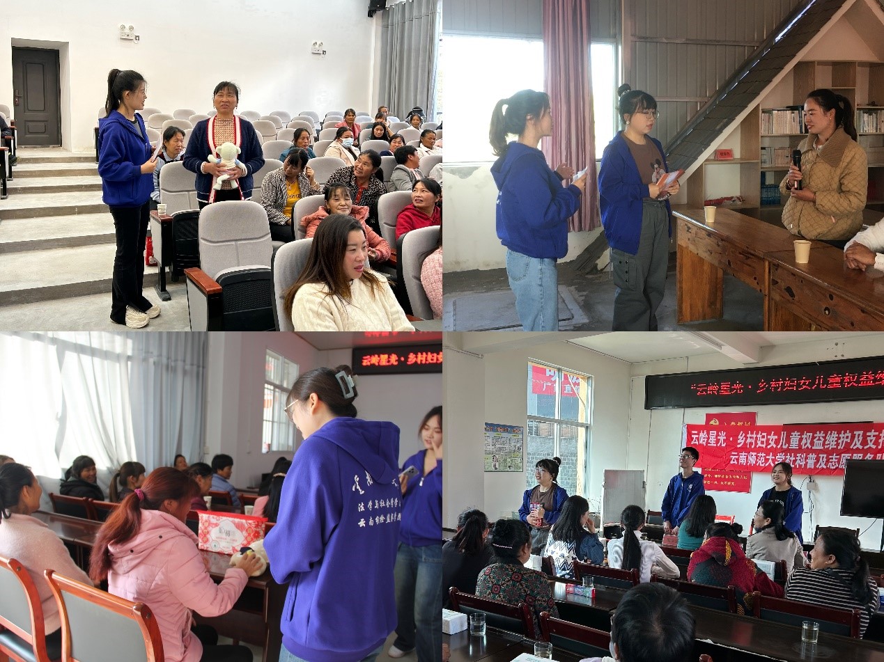 为认真贯彻习近平总书记关于妇女儿童和妇联工作重要论述,充分发挥妇联广泛联系妇女群众的优势,增强农村妇女尊法学法守法用法的自觉性和主动性,不断提高妇女维权意识和能力,11月9日至10日,学校乡村振兴办、妇女联合会及法学与社会学学院志愿服务团队联合梁河县妇联深入梁河县4个乡镇5个村开展“云岭星光·乡村妇女儿童权益维护”普法宣传活动,推进《民法典》《中华人民共和国反家庭暴力法》《中华人民共和国妇女权益保障法》、中华人民共和国家庭教育促进法》等法律法规进农村、进家庭,引导广大群众做“法律明白人”。