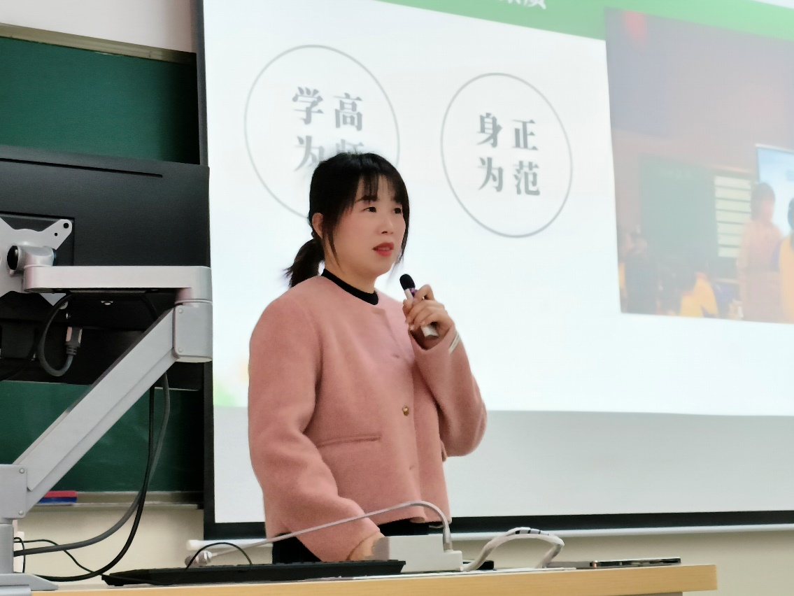 王琳老师以“做一束光,平凡中闪亮”为主题,用自己的亲身经历阐释了教师职业的价值与标准——敬业、博学、慈爱、创新、无私、情怀……王老师用“小学老师的工作日常”导入,首先给大家介绍了付出与收获背后深深的幸福感和获得感;其次通过课程标准、师生关系、科学管理等细节完美诠释了职业智慧;最后以从教多年的经验出发,从时间管理及综合素质方面为意向从教的同学们提了要求,激励在场的学生们注重时效,提高自我,提早规划。