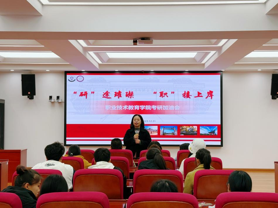为增强考研学子备考信心,鼓舞考研士气,缓解考试压力,12月21日,职业技术教育学院在一二·一西南联大校区明睿楼报告厅召开“‘研’途璀璨  ‘职’接上岸”2024届毕业生考研冲刺会,学院院长牛元帅、党委副书记向斯楠、副院长王黎智、侯昌东、辅导员、毕业班班主任及2024届考研学子参加大会。