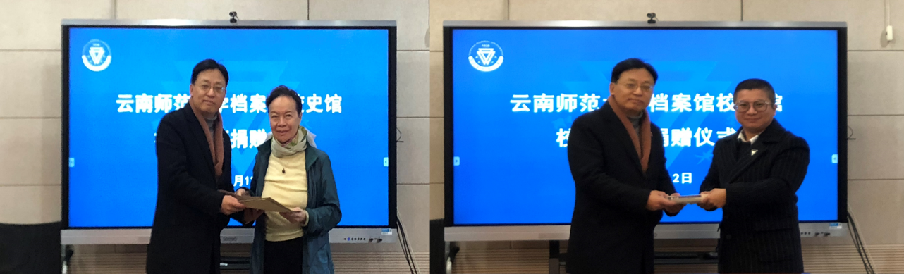 1月12日上午,原昆明师范学院副院长徐克之女刘岚女士向档案馆、校史馆捐赠徐克的图书资料和历史照片等珍贵实物,昆明铁路局觉晓雨先生向档案馆、校史馆捐赠无偿捐赠了李晨、彭允中、伍大希教授的图书资料等珍贵历史物件。档案馆、校史馆在一二一联大校区泛亚商学院109会议室举行捐赠仪式。
