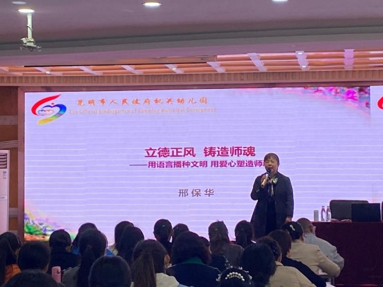 随后举行了两场讲座。第一场由云南省学前教育专家、昆明市人民政府机关幼儿园园长邢保华围绕“立德正风·铸造师魂”这一主题,由浅入深、由表及里,全面阐述了新时代幼儿园教师职业语言。