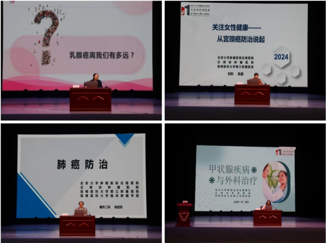 此外,北京大学肿瘤医院的四位专家刘洋、俞晶、向旭东和杨洁分别为大家开展了以“乳腺癌防治”、“宫颈癌防治”、“肺癌防治”、“甲状腺癌防治”为主题的专业知识讲座。