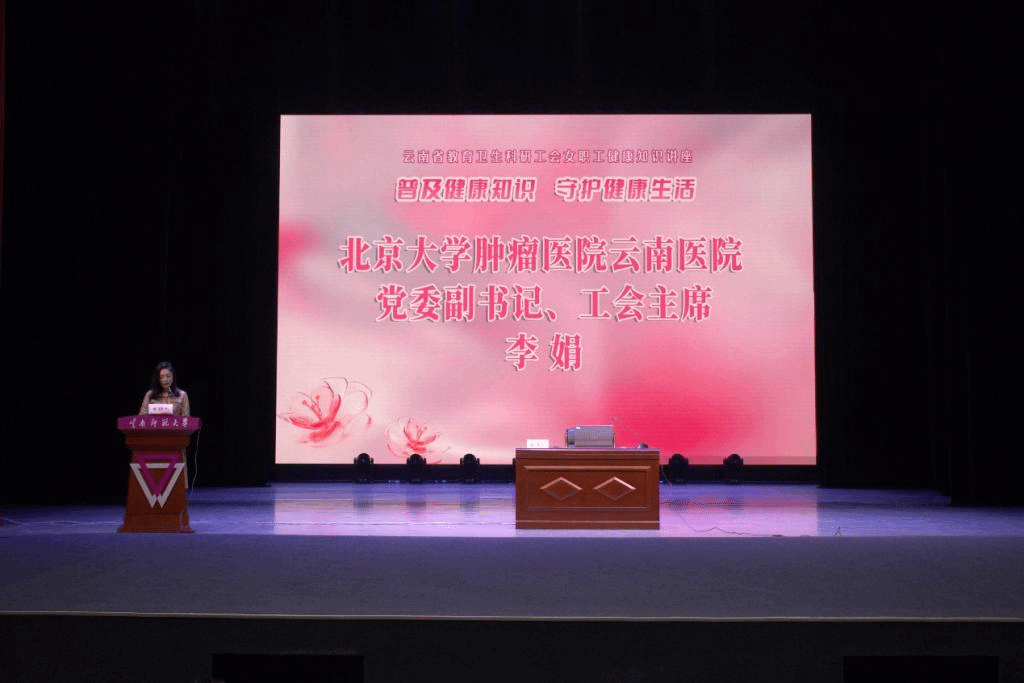 3月21日,由云南省教育卫生科研工会、北京大学肿瘤医院云南医院主办,云南师范大学工会、妇联、校医院、音舞学院联合承办的“普及健康知识 守护健康生活”职工健康知识讲座在呈贡主校区明德5号楼演播厅举行。云南省教育卫生科研工会副主席陈兆龙、女工委主任刘洪波,北京大学肿瘤医院云南医院党委副书记、工会主席李娟,以及北京大学肿瘤医院的六位专家、云南大学、昆明理工大学、云南师范大学、云南民族大学、云南交通职业技术学院工会的相关负责人和女教职工代表、学生代表共400余人参加活动。活动由校工会常务副主席金黄斌主持。