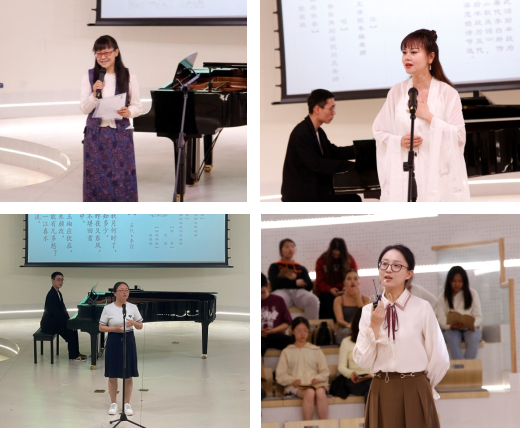 古与今,传承与创新。在用现代音乐解读古诗词的同时,活动中还穿插了演唱指导音乐舞蹈学院刘蕊老师的演唱分享,文学院李瑛老师、图书馆陆会琼老师、侯宇亮老师的导读,几位老师或对诗歌创作手法进行解读、或讲述诗词背后的故事、或分享读诗的体会,丰富了演出的内容与形式。