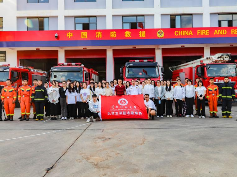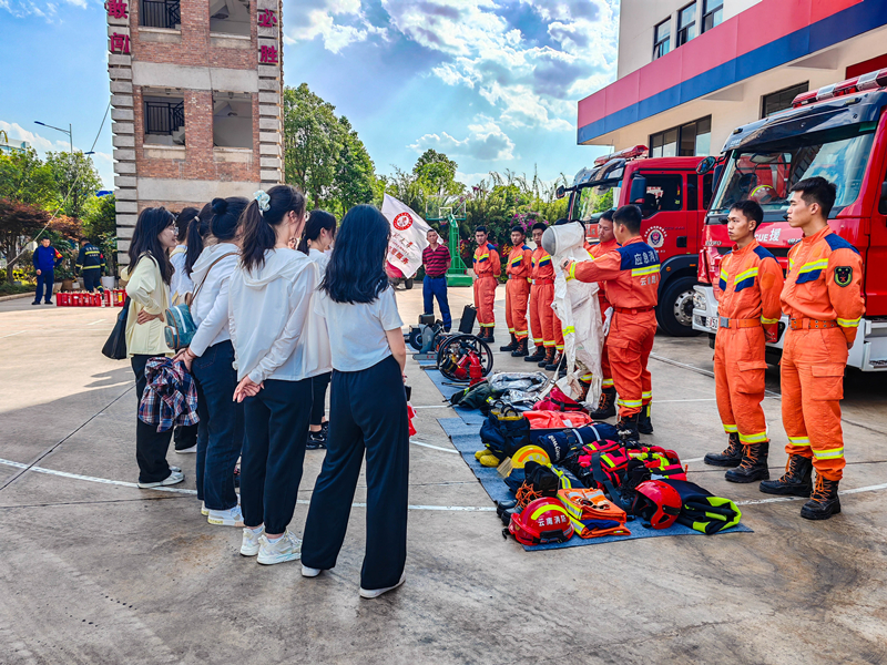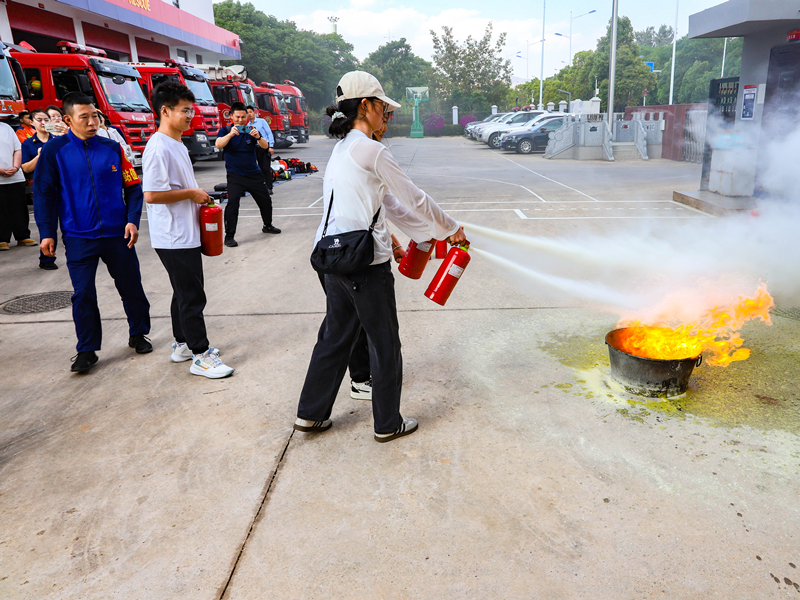 实地观摩体验过程中,呈贡消防救援大队的救援人员带领大家参观了消防车辆和各类消防装备器材,详细讲解了消防装备器材的用途及使用方法,志愿者逐一体验完成消防服的穿戴和灭火器的灭火实践操作。
