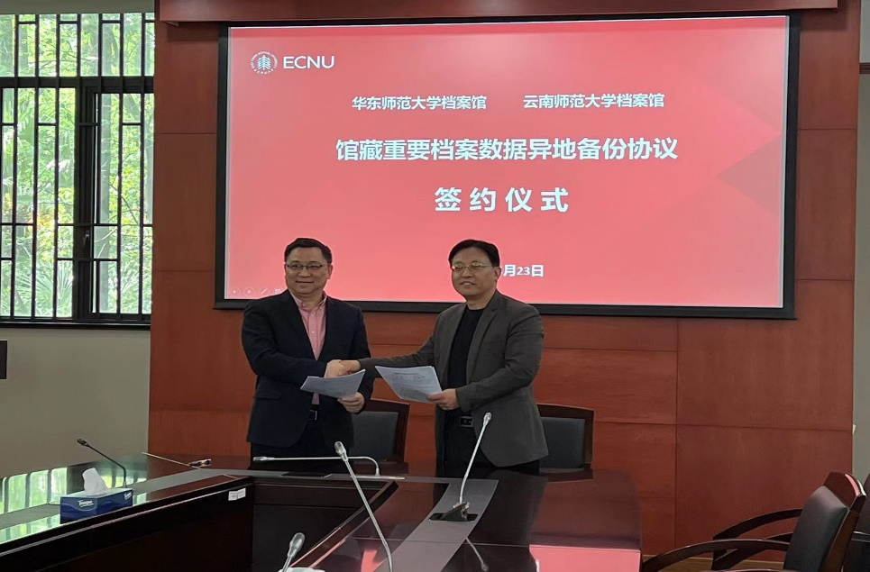 23日下午,云南师范大学档案馆与华东师范大学档案馆馆藏重要档案数据互为异地备份协议签署仪式在华东师范大学普陀校区档案学理论与实践研究中心举行。
