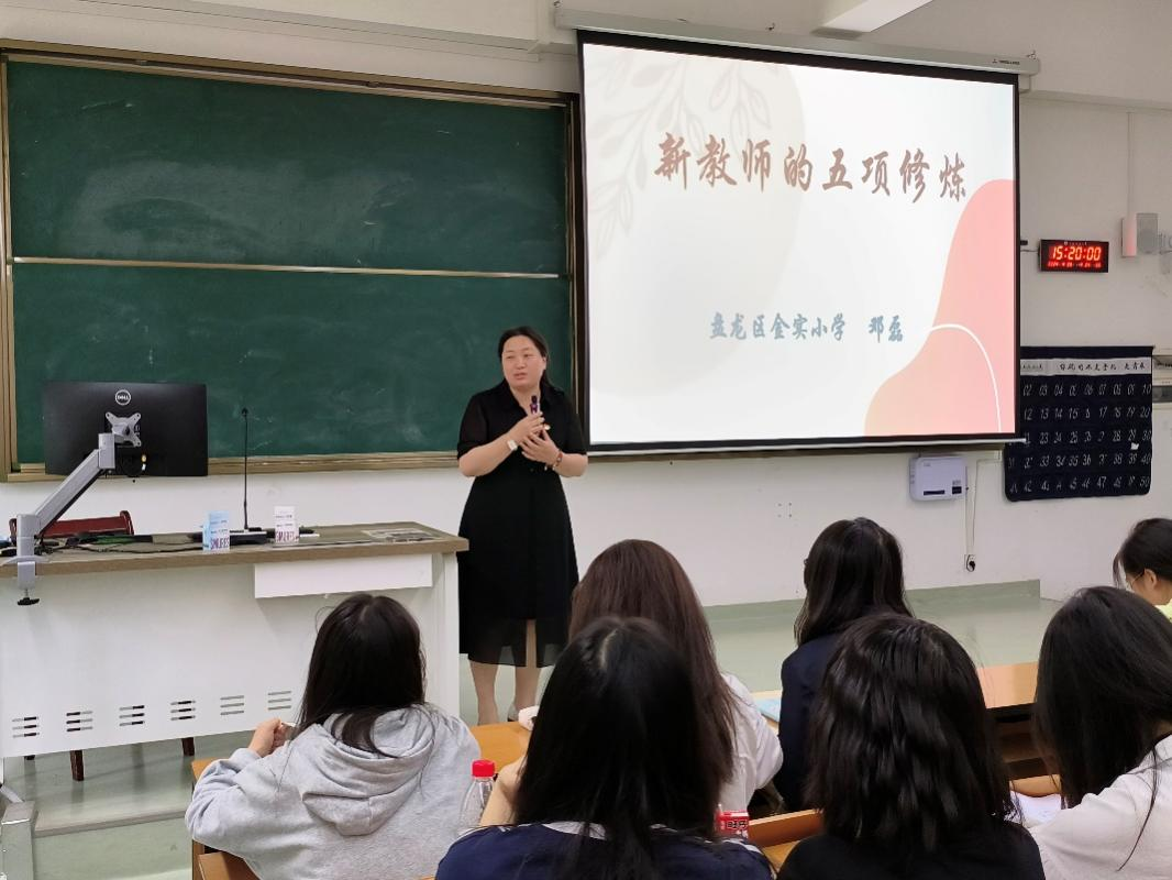邓磊老师首先以“新教师的五项修炼”为主题,从“好老师的定义”、“好老师的品质”、“教师专业发展的七个阶段”、“新教师的五项技能”等方面展开叙述,以生动形象的例子向同学们介绍了自己的学习和实践经验。接着,她从“会听”、“会说”、“会读”、“会写”、“会思”五个角度对教师职业能力和素养进行了解读。她以丰富的人生阅历、幽默风趣的语言、生动鲜活的案例,为我校师生带来了一顿知识盛宴,课堂互动氛围活跃。
