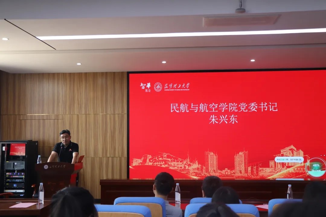 主题党课结束后,昆明理工大学民航与航空学院党委书记朱兴东从云南省民航发展历史、民航战略重要性、民航与航空学院的成立过程等方面全方位介绍了民航与航空学院的发展情况及成就。他讲话中强调,民航航空事业不仅仅是推动经济发展的重要力量,也是中国重要战略建设点。