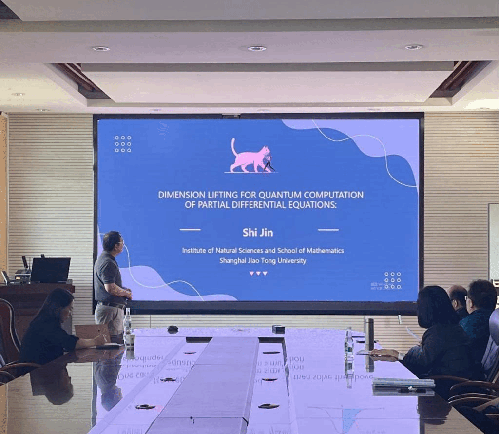 金石讲到,与经典计算机相比,由于量子计算机是基于量子力学原理设计的,所以最适合求解薛定谔方程.并通过维度提升,将非线性偏微分方程转化为线性偏微分方程,将线性偏微分方程转化为薛定谔型偏微分方程,从而可以进行量子模拟。量子计算机有可能获得代数甚至指数级的计算速度,这将可能引起21世纪的技术革命。最后,金石教授与学院师生开展问答互动,加深了他们对科学计算领域的了解,开阔了研究思路,提高了师生科研热情。