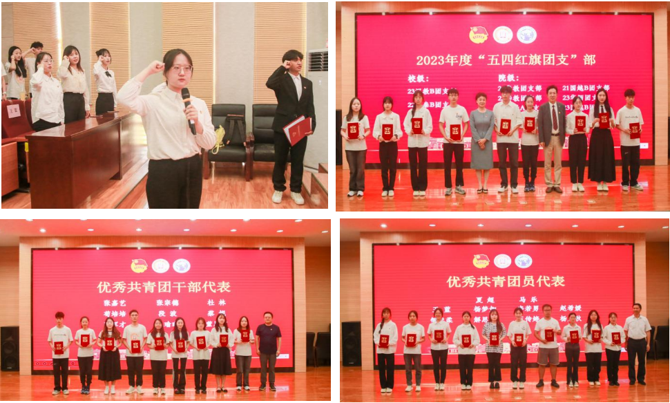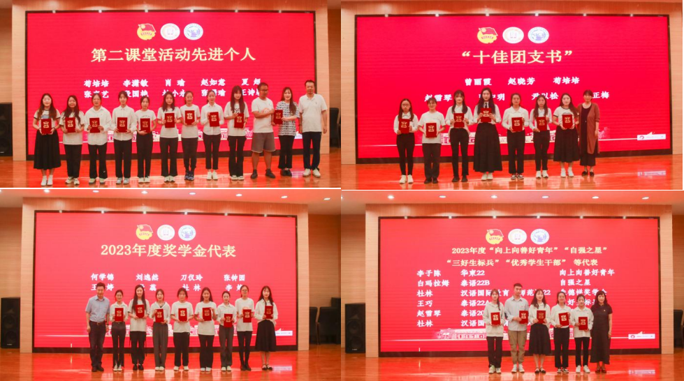 颁奖典礼上,与会领导依次为2023年度“五四红旗团支部”“优秀共青团干部”“优秀共青团员”“第二课堂活动先进个人”“三好生标兵”“奖学金优秀代表”“十佳团支书”等10个先进集体和52名先进个人代表颁奖。