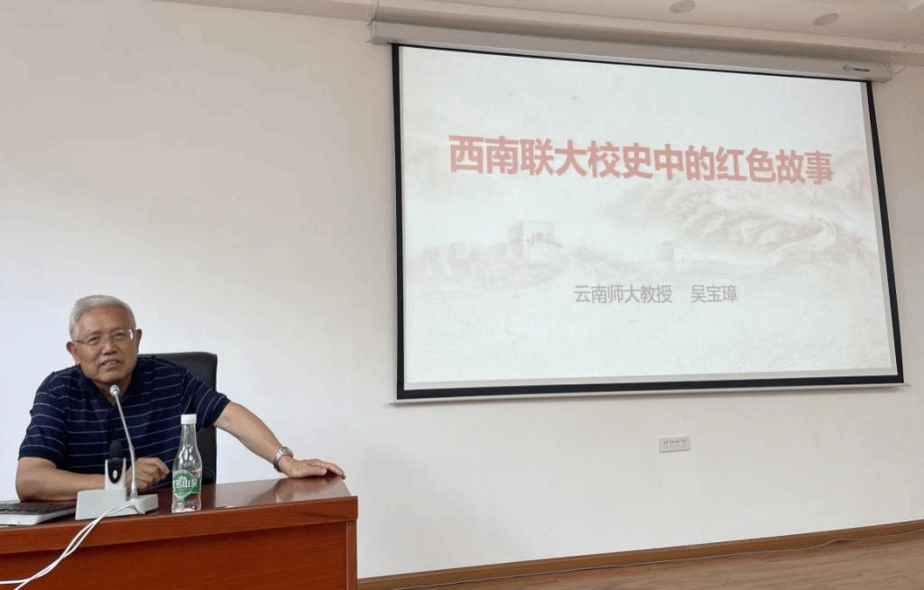 本次专题讲座由全国老有所为先进典型人物、云南省中国近代史研究会名誉会长、云南省政府特殊津贴获得者、云南师范大学吴宝璋教授主讲。吴宝璋以《西南联大校史中的红色故事》为题,讲述了联大党组织团结广大师生,在开展抗日爱国民主运动中发挥核心作用,以及西南联大地下党员参加革命斗争的传奇经历与流血牺牲的感人故事。