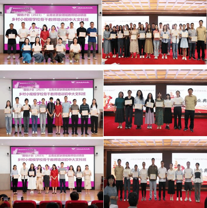 6月16日,“国培计划(2023)”-云南省紧缺领域小规模学校骨干教师培训项目小学大文科、初中大文科培训班分别在一二一联大校区和莲花宾馆举行结业仪式,仪式上还颁发了优秀学员证书和结业证书。