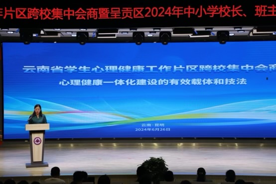 6月26日,云南省学生心理健康工作片区跨校集中会商在昆明理工大学附属呈贡学校举办。本次会商研讨由云南省委教育工委、云南省教育厅主办,云南省学校心理健康工作专家指导委员会秘书处(云南师范大学)、云南师范大学心理健康教育咨询中心承办,昆明市教育体育局、曲靖市教育体育局、楚雄州教育体育局、昭通市教育体育局协办。昆明市教育体育局党组成员、总督学王竞元,云南省学校心理健康工作专家指导委员会委员代表,昆明市、曲靖市、楚雄州、昭通市各级各类从事心理健康教育工作的管理人员、专兼职教师、班主任及部分在昆高校心理健康教育咨询中心教师代表等250余人现场参与,近万人线上同步参会。