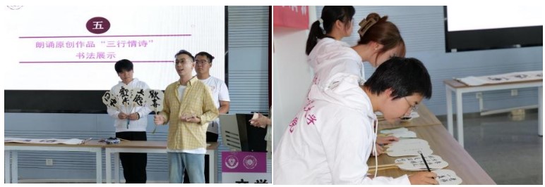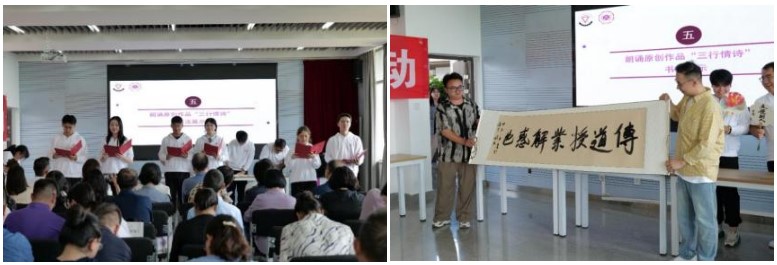 学生代表现场用朗诵作品“三行情诗”向老师表达感谢,书法协会的同学用现场创作书法向老师们表达祝福。