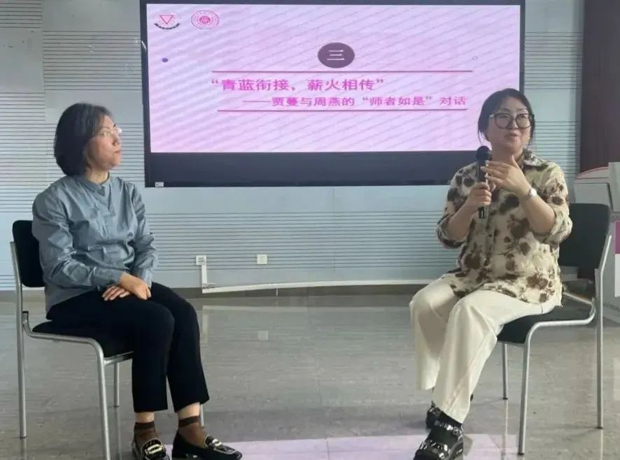 贾蔓老师与周燕老师开启“青蓝衔接,薪火相传——师者如是”对话。周燕老师分享了到学院工作以来的许多温暖瞬间,回顾了学院老教师对自己教学、科研“传帮带”的故事。贾蔓老师分享了自己从教37年以来的感悟,“对学院有爱、对学生有爱、对自己有爱。”感人至深的话语里,浸透了老师对学院的无限热爱,对学生的无限关怀。