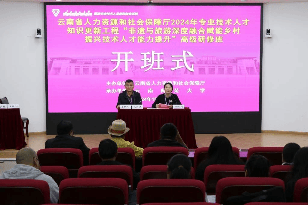 10月15日,云南省人力资源和社会保障厅专业技术人才知识更新工程2024年“非遗与旅游深度融合赋能乡村振兴技术人才能力提升”高级研修班在我校举行。本次研修班由云南省人力资源和社会保障厅主办,云南师范大学继续教育学院承办,来自全省从事文化、旅游相关工作的专业技术人员、管理人员和非遗传承人50余人参加了研修。