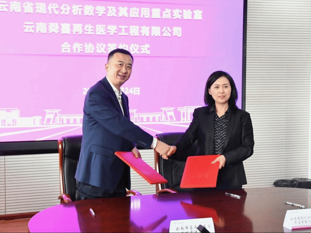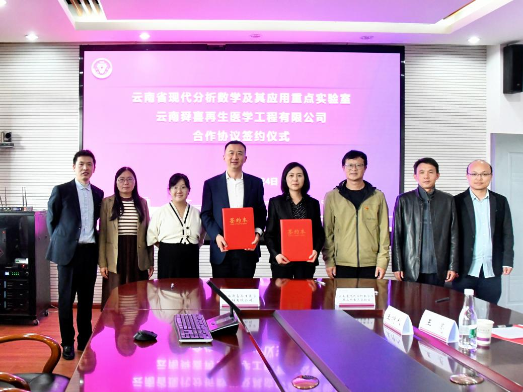 10月24日,我校云南省现代分析数学及其应用重点实验室(以下简称“重点实验室”)与云南舜喜再生医学工程有限公司(以下简称“舜喜医学公司”)合作协议签约仪式在数学学院会议室举办。云南舜喜再生医学工程有限公司总经理姜小锋、数学学院党委书记王世波、院长刘祥清,学校校友工作与国内合作办公室副主任罗敬,重点实验室骨干成员和舜喜医学公司代表出席签约仪式。