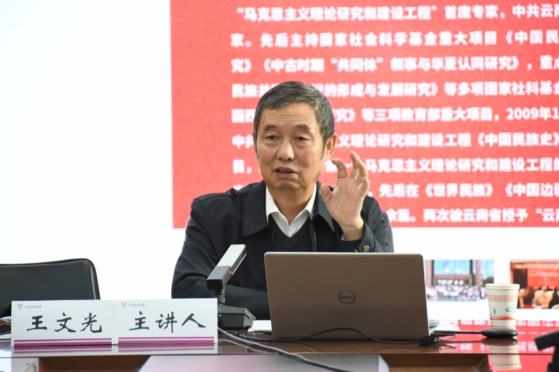 会上,王文光教授同与任课教师展开交流,针对教师提出的问题做出了一一回答,现场气氛热烈、融洽。老师们纷纷表示,要按照相关要求,以课程建设为契机,深耕细挖教材内容,扎扎实实把《中华民族共同体概论》课讲好,推动学科建设、学术研究、课程建设与人才培养一体化推进,积极推动铸牢中华民族共同体意识教育在云师落实落地。