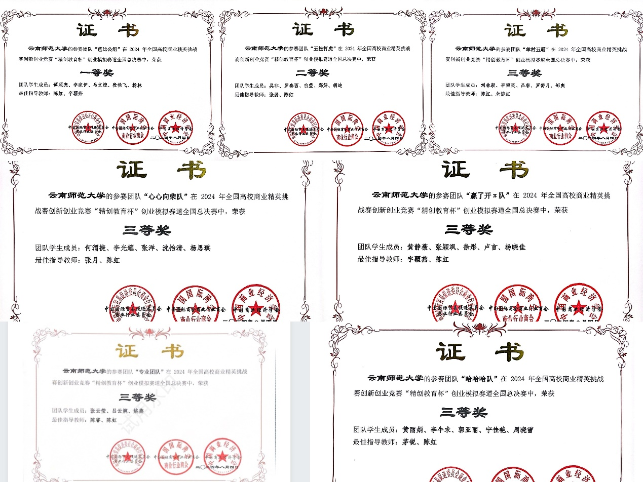 2024 年 8 月 3 日至 4 日,全国高校商业精英挑战赛创新创业竞赛 “精创教育杯” 创业模拟赛道全国总决赛落幕。云南师范大学教育学部应用心理学专业的 7 个队伍 33 名同学表现优异,荣获一等奖 1 项、二等奖1 项、三等奖5 项。