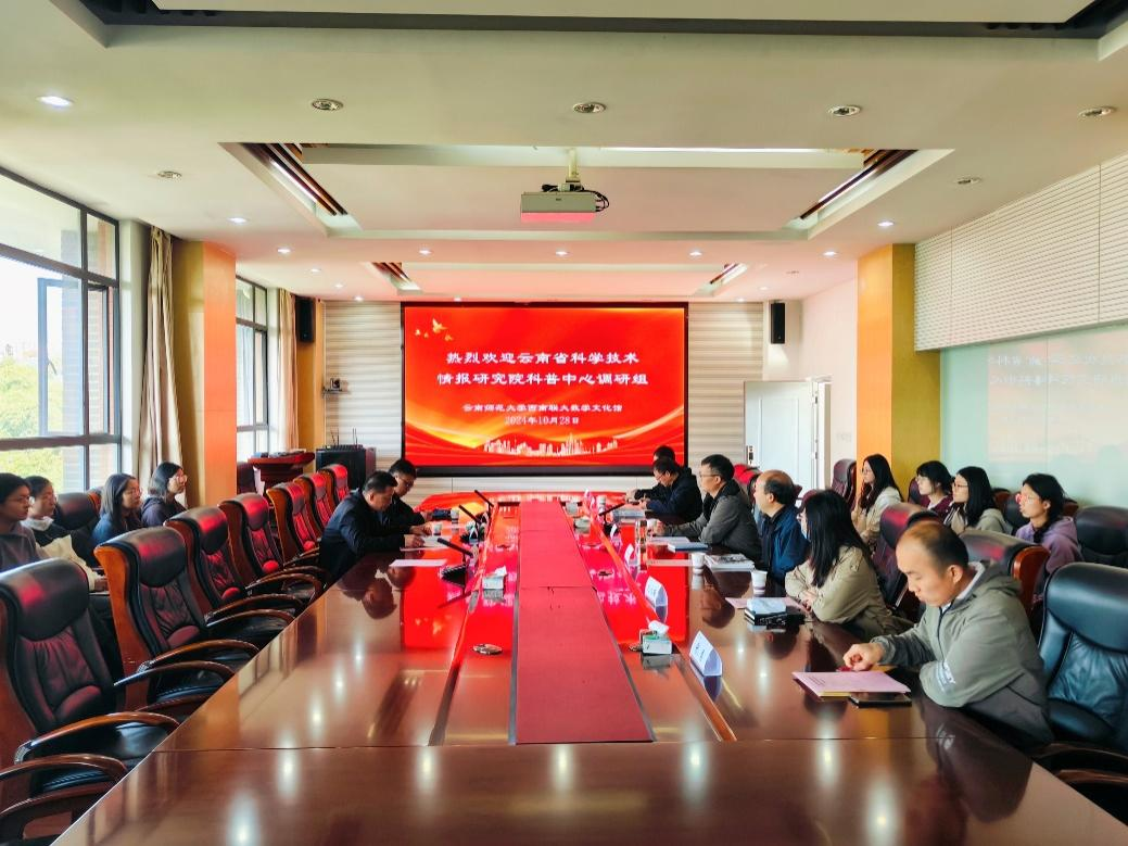 10月29日,云南省科学技术情报研究院调研组到数学学院调研西南联大数学文化馆省级科普基地以下简称“科普基地”),云南省科学技术情报研究院科普中心研究员武卫助理研究员马光逵科技处副处长罗毅、数学学院副院长兼科普基地负责人王天志科普基地成员及科普志愿者代参加调研座谈会。数学学院党委书记王世波主持会议