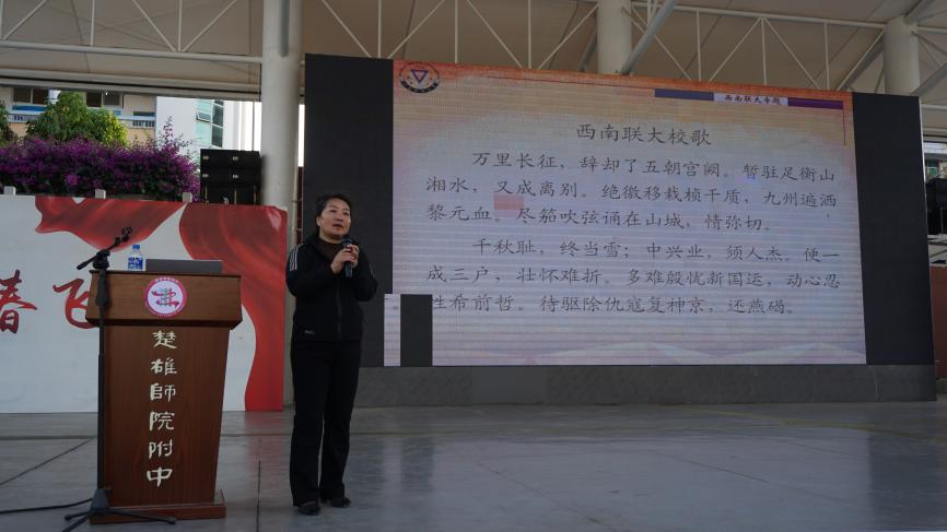 西南联大博物馆馆长李红英向楚雄师院附中全校师生们带来了题为《历史与今天的对话》的主题宣讲。宣讲从西南联大的概况、历史贡献等方面展开,她向大家介绍了“两弹一星”功勋王希季,中国科学院院士、国际焊接工程专家潘际銮,投身军旅的夏世铎,年逾百岁依然笔耕不辍的作家马识途等联大校友的事迹,讲述他们在艰苦条件下始终坚持读书报国的奋斗故事,分享了西南联大博物馆在走访联大校友及亲属时的感人故事、动人瞬间,利用生动的叙述和丰富的影像资料,向大家再现了联大师生的成长历程,展现他们与国家民族同呼吸、共命运的精神风貌,引起师生们的强烈共鸣。