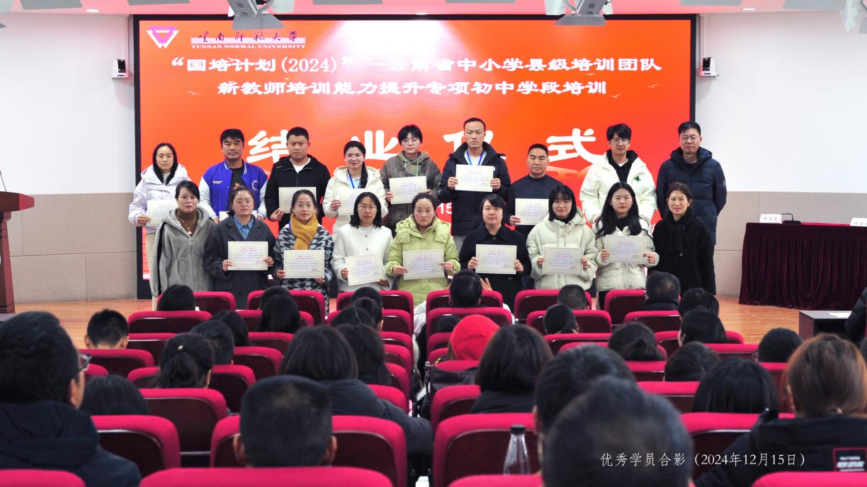 12月15日,“国培计划(2024)”——云南省中小学县级培训团队新教师培训能力提升专项培训项目第二期(初中学段)培训结业仪式在西南联大校区举行。继续教育学院副院长刘应兰、项目管理团队、201名学员参加了结业仪式,仪式上颁发了结业证书和优秀学员证书。