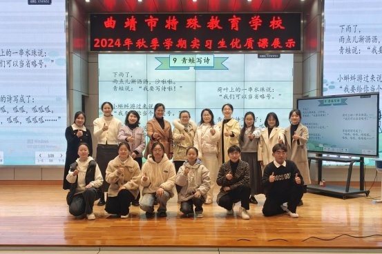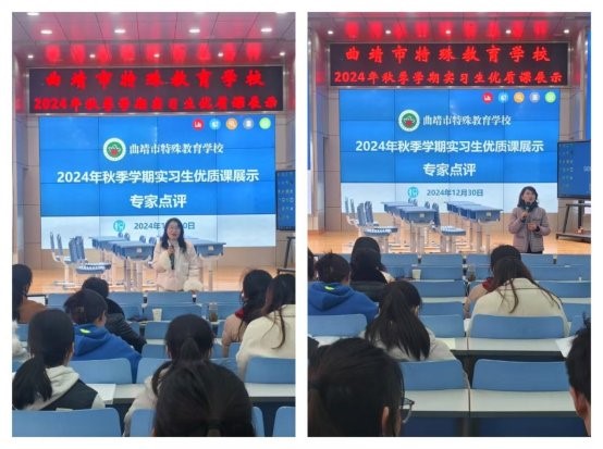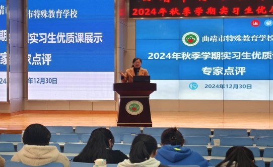 张晓燕、周圆圆、张磊对曲靖市特殊教育学校表示感谢,对实习生们的表现给予肯定,并对展示中的教学设计、课件制作、师生互动等方面进行专业点评,提出了具体的改进建议。