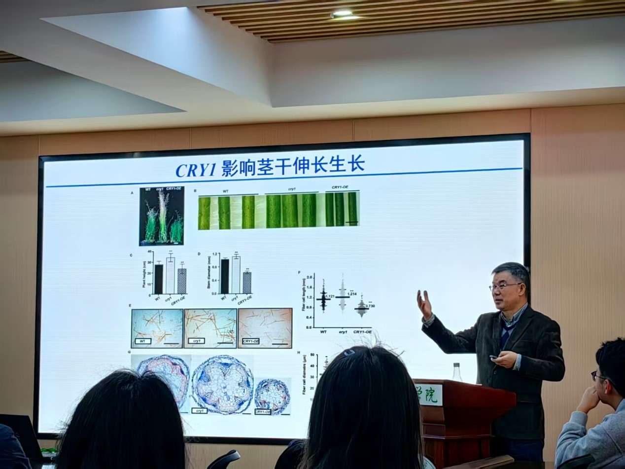 在讲解细胞壁形成的多层级的转录调控网络时,李来庚研究员更是凭借其扎实的专业功底和丰富的研究经验,将错综复杂的调控关系梳理得井井有条。他以 AtVRLK1 基因为例,深入探讨了该基因如何影响花粉从花药中释放,以及其在花药药室内壁细胞壁加厚过程中的关键作用,进一步阐述了 AtVRLK1 协调细胞伸长与细胞壁加厚的调控机制。这一部分内容不仅展现了植物细胞壁研究的前沿进展,也为作物遗传改良提供了新的思路和方向。