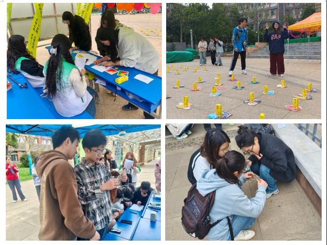 活动场地设置在贝壳广场、东区食堂旁大礼堂空地、紫藤长廊、红烛广场5个区域,设有圈数成和、障碍连线、华容道+汉诺塔、数独、数字食物链、数字扫雷、24点游戏、符号填鸭、九连环等12个趣味项目,现场气氛热烈,吸引了学校师生踊跃参与。