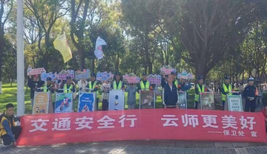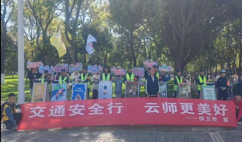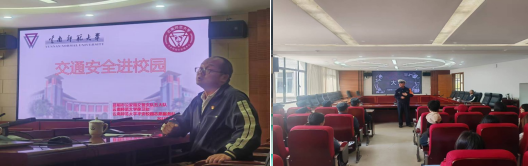 为进一步增强师生交通安全意识,营造文明和谐的校园环境,3月27日下午,保卫处组织开展“交通安全进校园”专题活动。昆明市公安局交通警察支队五大队民警王磊、学校平安校园志愿服务大队、保安公司人员、学生代表参加了活动。活动包括室内讲座、室外培训两个阶段。