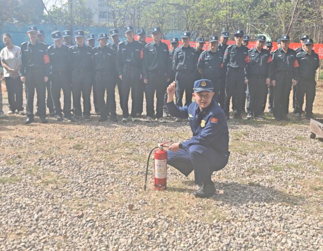 灭火演练环节,消防员现场示范了干粉灭火器的正确操作方法,师生代表现场观摩学习。