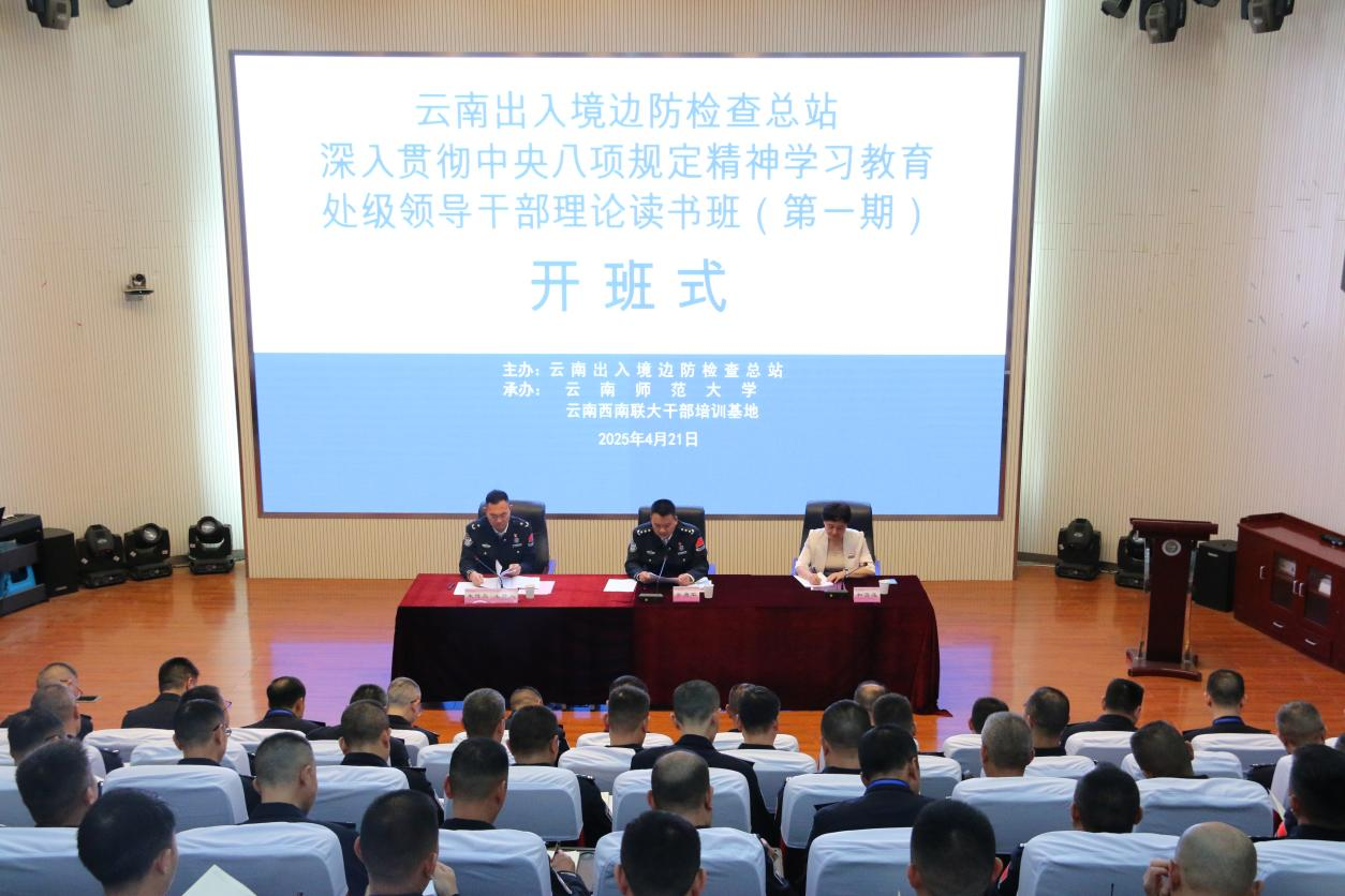 4月21日上午,由云南边检总站主办,云南西南联大干部培训基地承办的“深入贯彻中央八项规定精神学习教育处级领导干部理论读书班(第一期)”在我校呈贡校区开班。云南边检总站党委副书记、政委吴勇军,我校党委副书记和雪莲参加开班仪式。全省各边防检查部门处级干部79人参加培训。开班仪式由云南边检总站党委委员、政治处主任朱传亮主持。