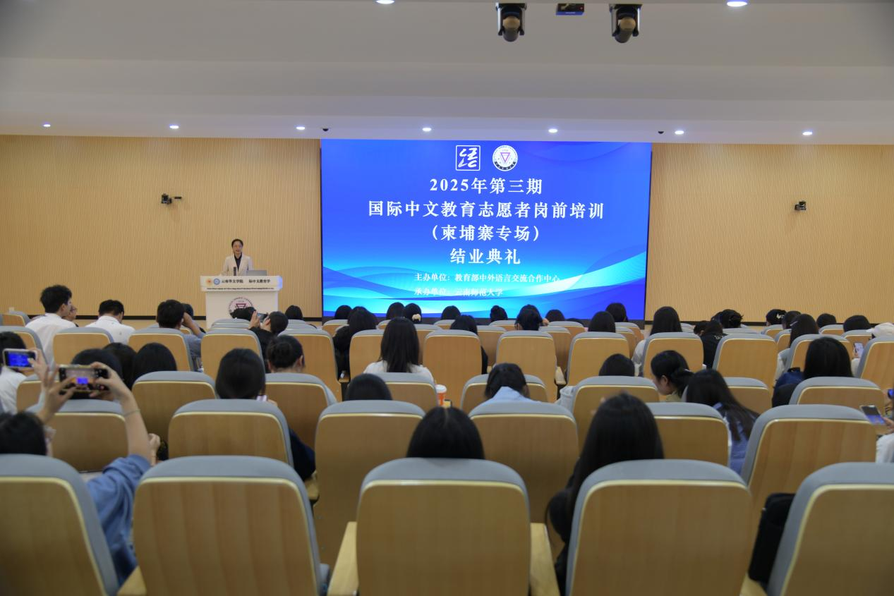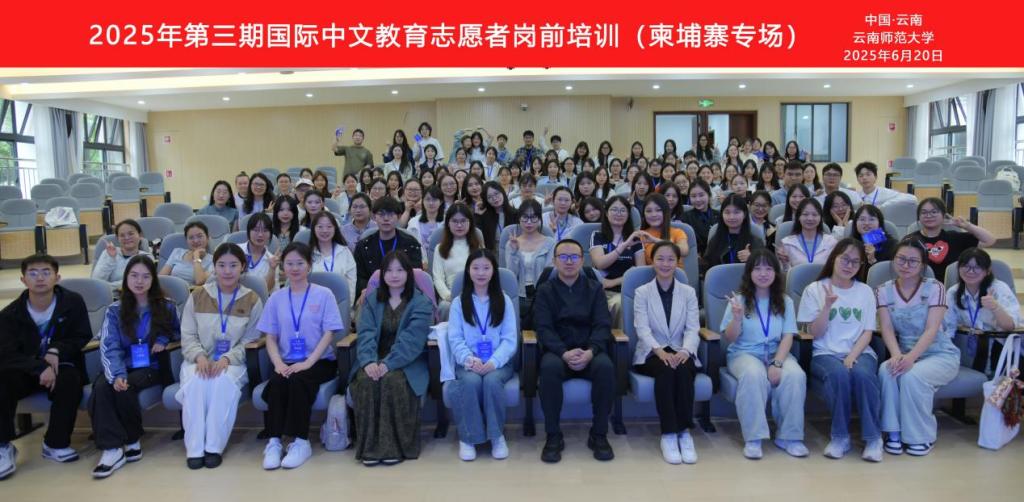 6月20日,由教育部中外语言交流合作中心主办、云南师范大学承办、国际中文教育学院执行的2025年第三期国际中文教育志愿者岗前培训(柬埔寨专场)结业典礼在我校举行。云南师范大学国际中文教育学院副院长戴思远、全国64所高校的106名志愿者、工作人员、班主任参加结业典礼。
