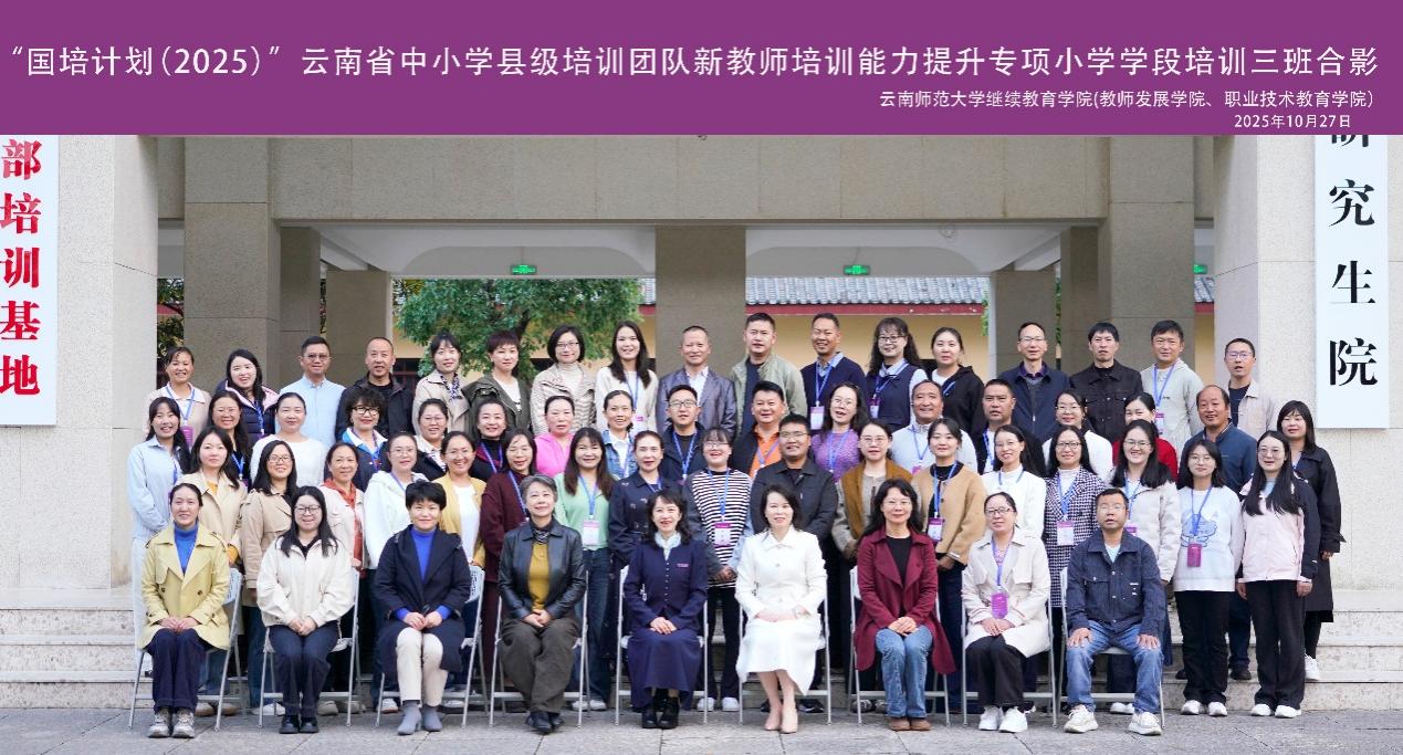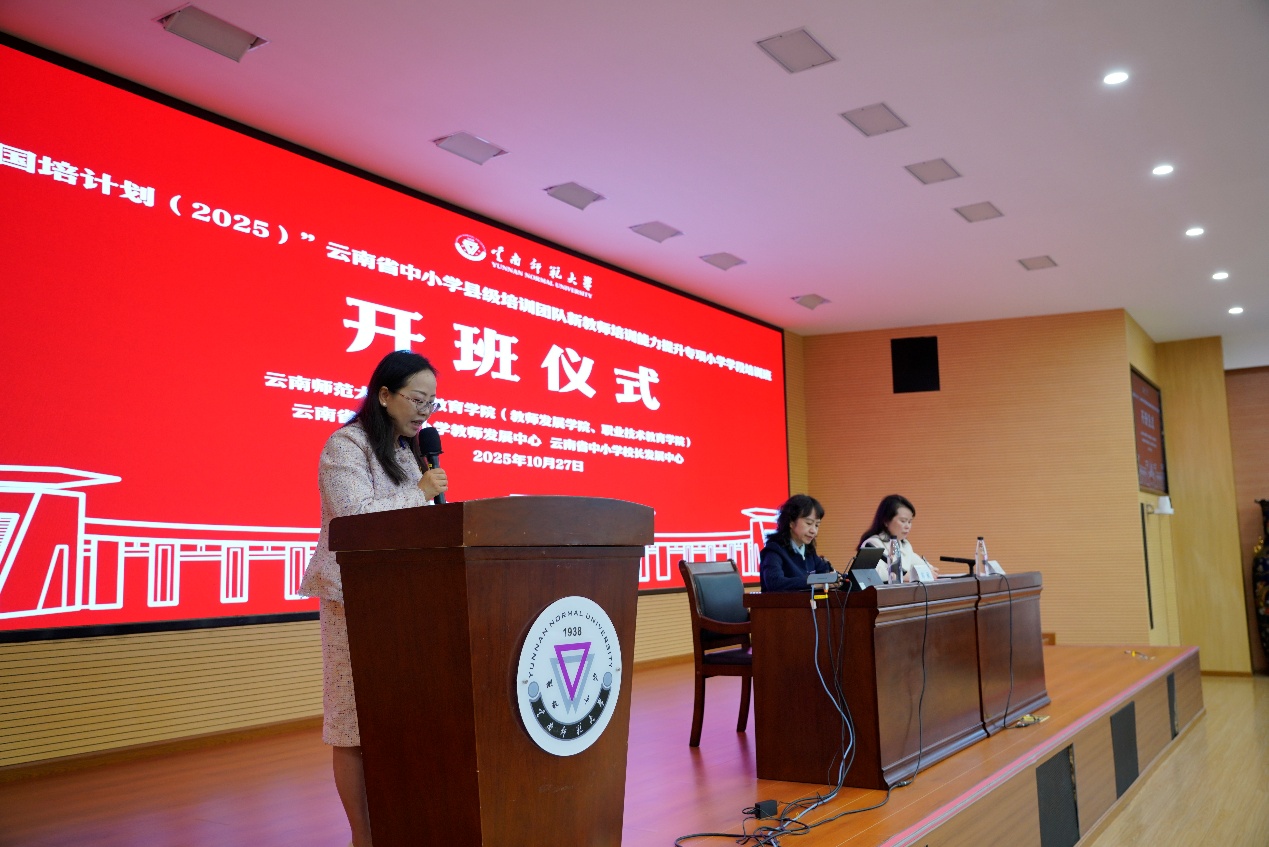 10月27日,由我校继续教育学院(教师发展学院、职业技术教育学院)组织实施的“国培计划(2025)”——云南省中小学县级培训团队新教师培训能力提升专项小学学段培训班在一二·一西南联大校区开班。学院党委书记邹飒、副院长刘应兰,项目管理团队以及来自全省各州县师训部门负责人、教研员、乡村学校和跟岗基地校的双校双指导教师,共计169名研修人员参加了开班仪式。刘应兰主持开班仪式。