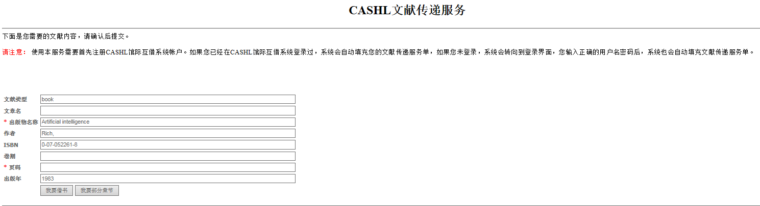 5、在CASHL文献传递服务页面,读者可以选择“我要借书”(借整本书),或“我要部分章节”(需要输入相应页码)。以借整本书为例,点击“我要借书”按钮,进入下一个页面。