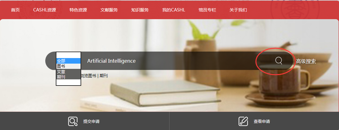 3、检索文献,提交文献传递申请。CASHL主页可以检索3类文献资源,即图书、期刊和文章。在检索框中输入检索词,点击检索框右边的一个类似于放大镜的按钮即可检索文献。