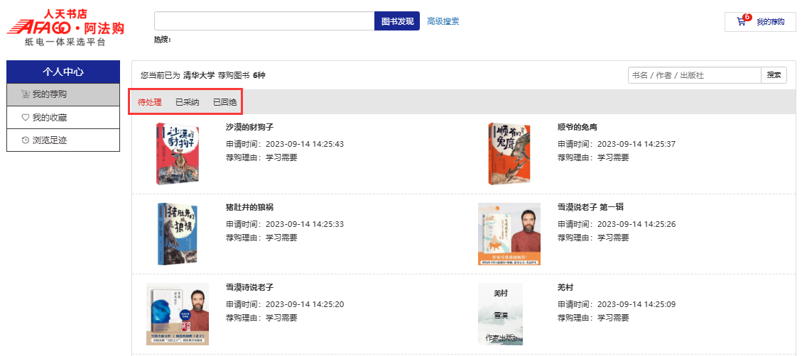 4. 我的荐购:【个人中心】→【我的荐购】中可查看到所有的荐购书目及图书馆的采纳情况。