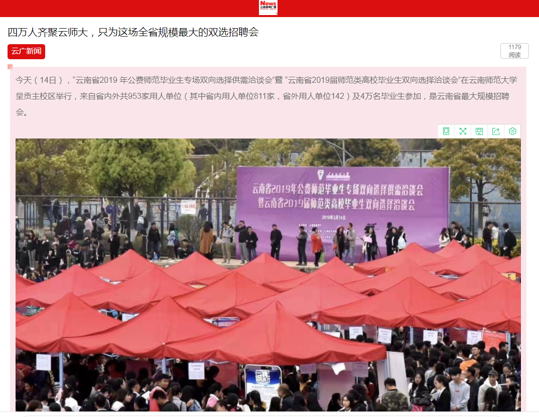 上一条:云报 2019-03-14 云南省举行师范类高校毕业生双向选择洽谈会 下一条:春城晚报 2019-03-15 师范类招聘会在云师大举行,4万名毕业生挤爆现场