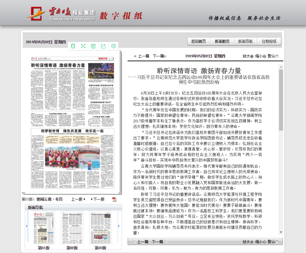 云南日报 2019-05-02 聆听深情寄语 激扬青春力量——习近平总书记在纪念五四运动100周年大会上的重要讲话在我省高校师生中引起热烈反响