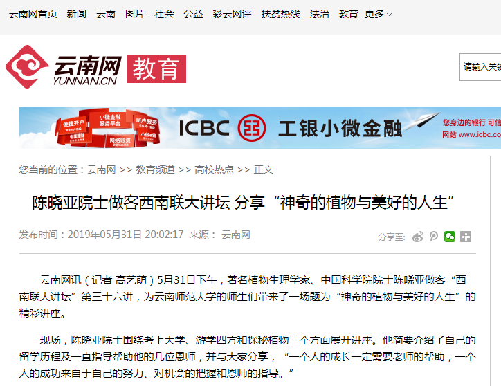上一条:云南日报 2019-06-01 中科院院士陈晓亚做客西南联大讲坛 下一条:春城晚报 2019-06-03 著名植物生理学家陈晓亚做客西南联大讲坛第三十六讲