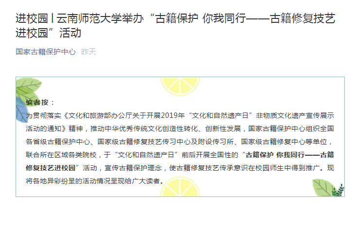 上一条:云南新闻联播 2019-06-07 坚守初心不忘本 当好新时代答卷人“不忘初心、牢记使命”主题教育在我省干部群众中反响热烈 下一条:云南网 2019-06-10 云南省古籍保护中心举办“古籍修复技艺进校园”活动