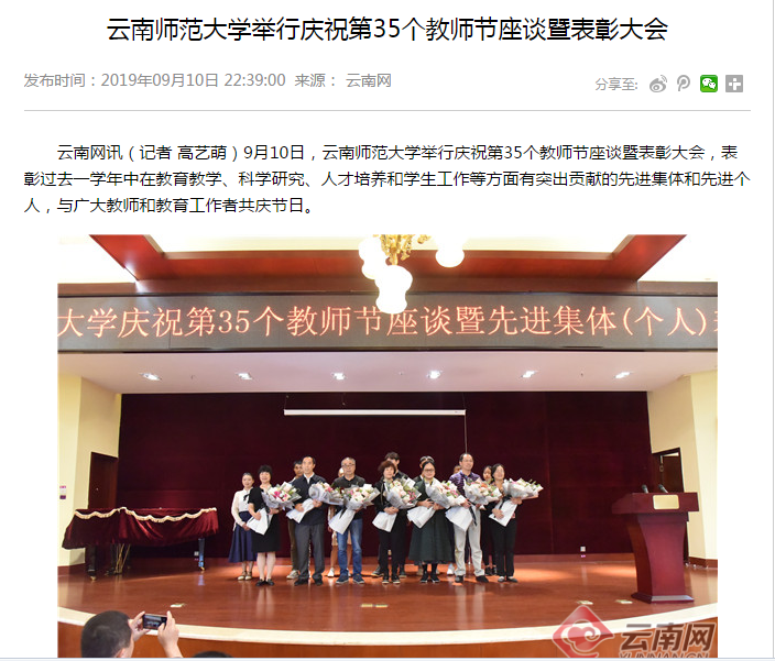 云南网 2019-09-10 云南师范大学举行庆祝第35个教师节座谈暨表彰大会