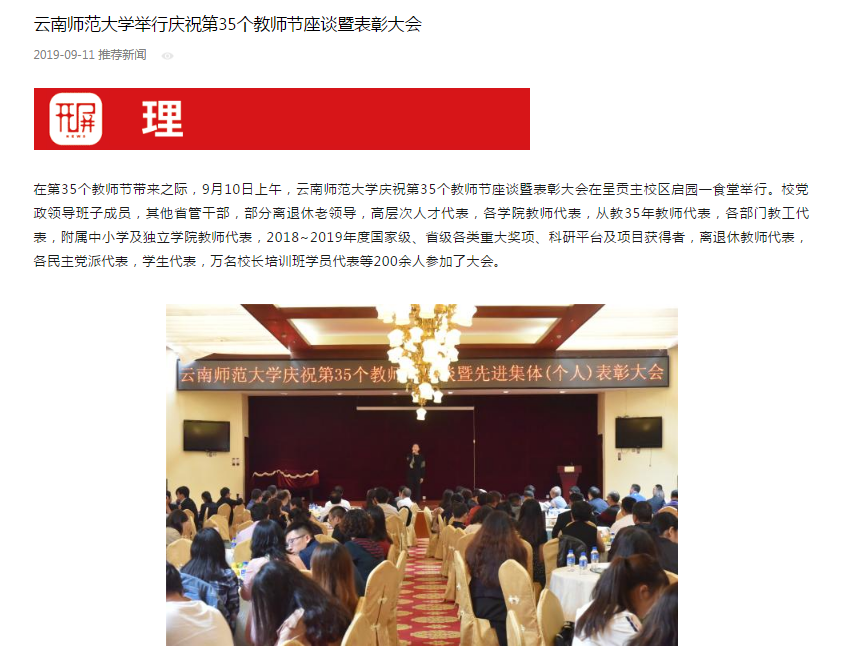 春城晚报 2019-09-11 云南师范大学举行庆祝第35个教师节座谈暨表彰大会