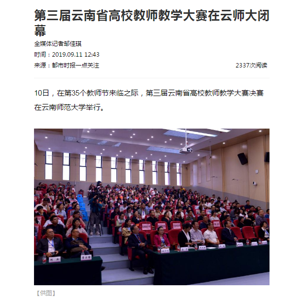 上一条:云南日报 2019-09-11 云南省高校教师 教学大赛决赛落幕 下一条:云南网 2019-09-10 云南师范大学举行庆祝第35个教师节座谈暨表彰大会