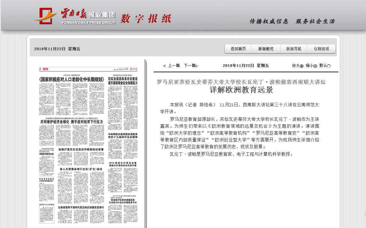 上一条:春城晚报 2019-11-22 罗马尼亚苏恰瓦史蒂芬大帝大学校长瓦伦丁·波帕做客西南联大讲坛 下一条:昆明日报 2019-11-22 全省1300名教卫科系统职工参加气排球赛